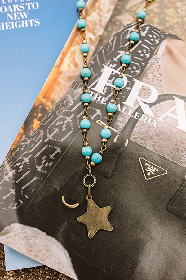 - A necklace featuring turquoise hued semi precious beads and a dangling bronze star pendant