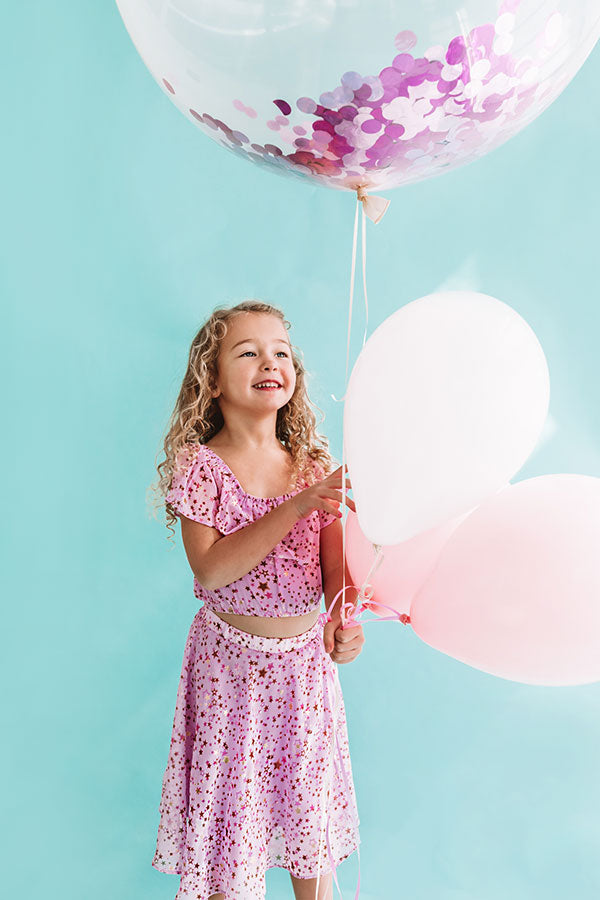 The stars are sure to align when you match your mini me in this adorable top featuring lightweight material patterned with gold stars, an elastic scooped neckline that can be worn off-the-shoulder with drop sleeves, and an overlaid bodice that falls into a straight hemline!
