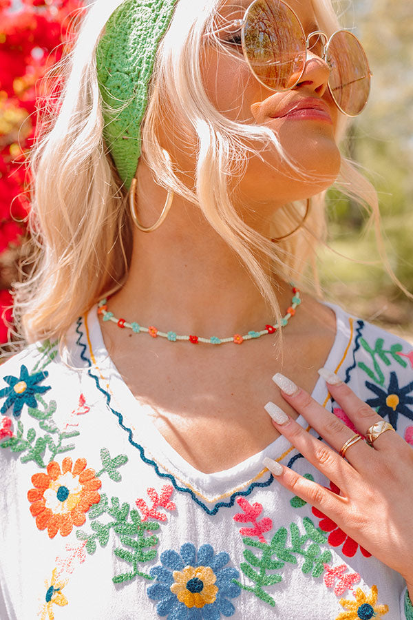 Who needs sunshine when you have a necklace this cute?! This darling accessory features a short white beaded chain with dainty mint and red flower accents!