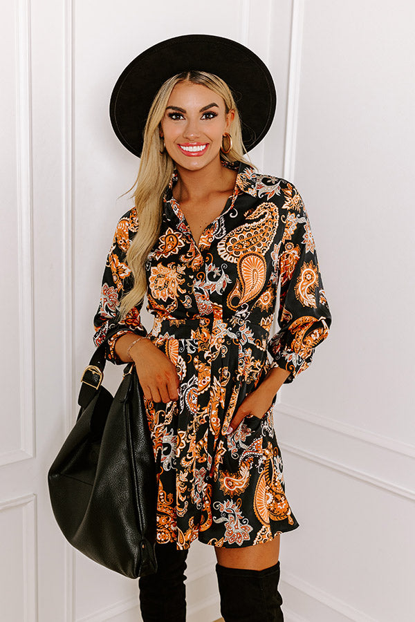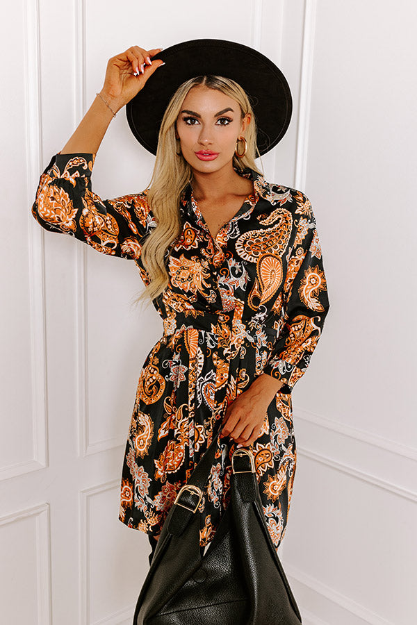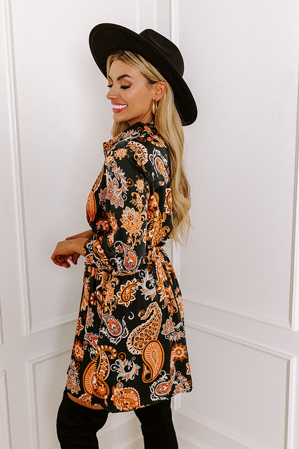 Pumpkin spice and everything nice is what fall is made of and you'll be ready for the festivities in this sweet dress! Features black satin material with orange and ivory hued paisley design, collared neckline that goes into a button down front, long loose sleeves with cuffs and button closure, flattering elastic banded waistline, hidden side pockets, and a relaxed skirt silhouette that falls to a straight mid-thigh length hemline.