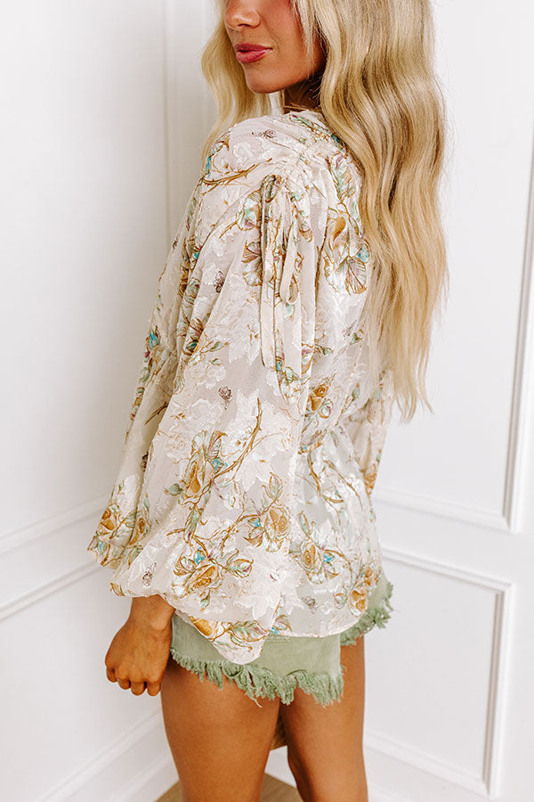 - Long, loose sleeves with ruched shoulder detail and elastic cuffs