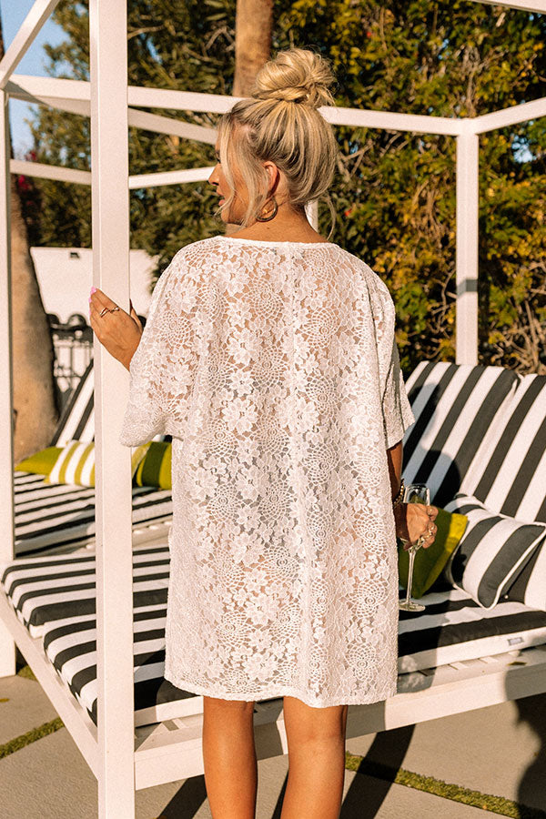 Wow the crowd in our dainty white 'Take A Trip' shift tunic featuring lightweight and delicate lace material, a v-cut neckline, loose short sleeves, and a draped silhouette that falls into a straight upper-thigh length hemline with accent side slits! For additional coverage, we recommend styling over your fave bralette or camisole!