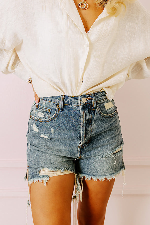 You are sure to love our trendy 'Bobbi' shorts featuring lightweight medium wash denim material with subtle accent fading and distressed detailing, a high waistline with belt loops, five pocket cuts, a hidden zip fly with a button closure, and a relaxed silhouette that falls into ultra frayed upper-thigh length hemlines!