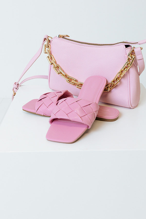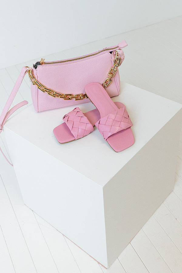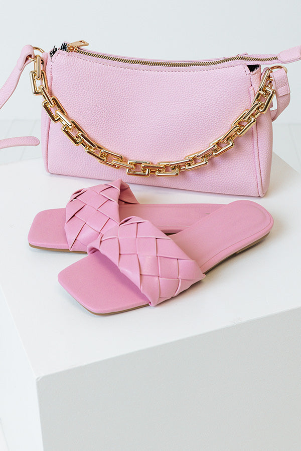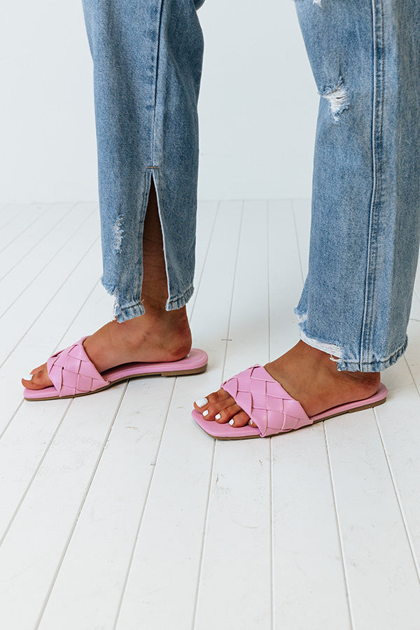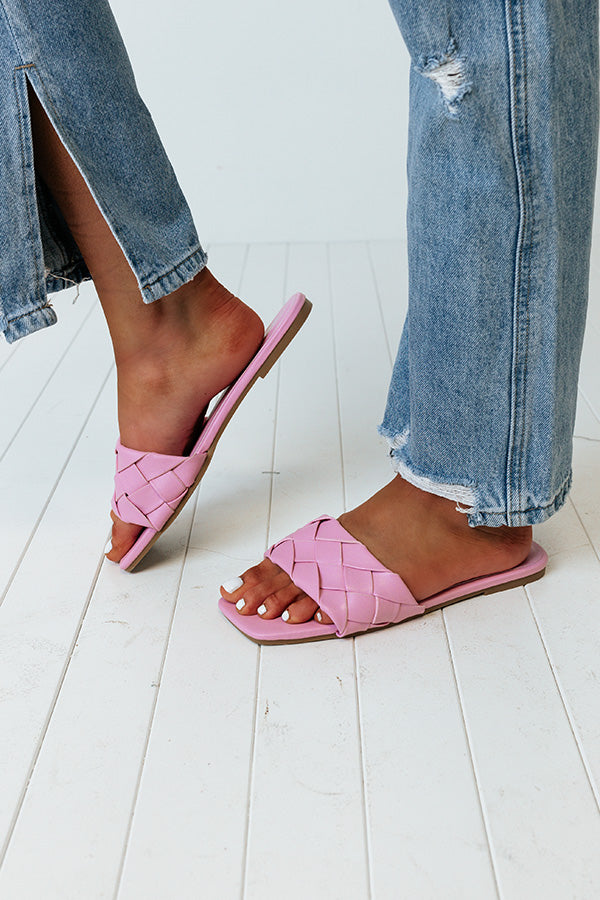 Step out in style in our darling pink 'Brynley' sandal featuring a wide woven faux leather over-the-foot strap, a square open toe, a flat sole, and a lightweight slip-on silhouette! This sandal runs more true to size.