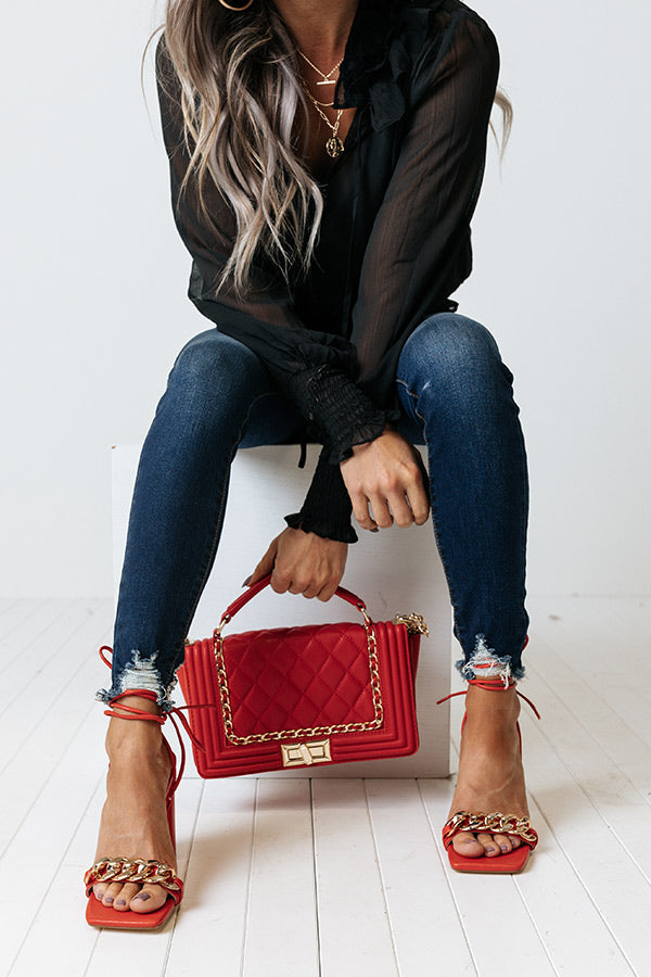 People are sure to be stunned by how cute our flirty red 'Emilio' heels are with their square open toe, gold chain over-the-foot strap, 4.5-inch block heel, and chic lace up silhouette! This heel runs more true to size.