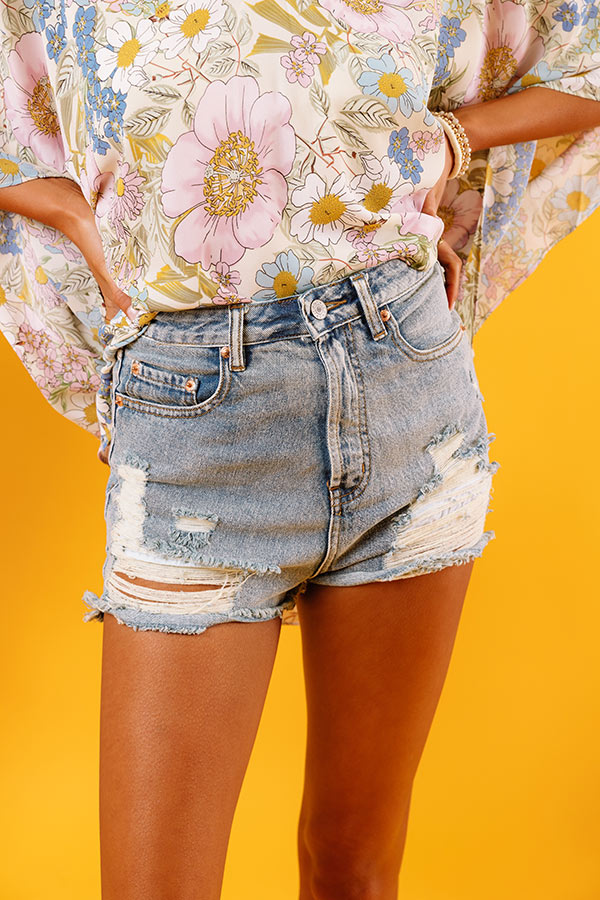 The adorable 'Joanna' shorts feature lightweight stretchy denim material, ultra distressed detailing, a high waist fit, a hidden zip fly with a button closure, belt loops, a light wash color, five pocket cuts, and a relaxed silhouette that falls into frayed raw cut upper thigh length hemlines!