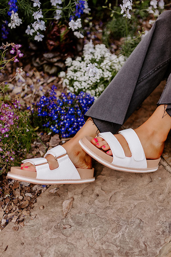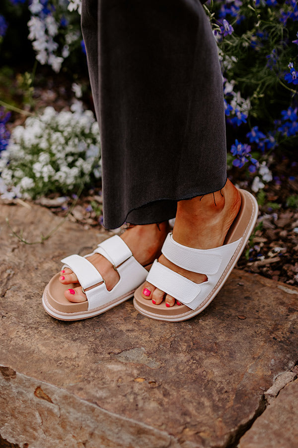 Slide into summer in our adorable ivory colored 'Kanan' sandal featuring two wide over-the-foot faux leather straps with velcro closures, a rounded open toe, a flat sole, and a slip-on silhouette! This sandal runs more true to size.