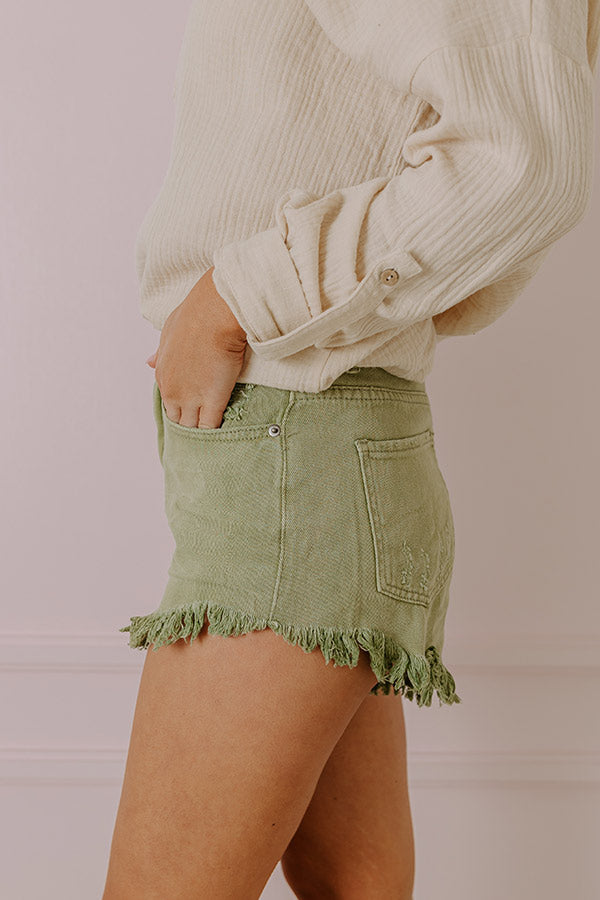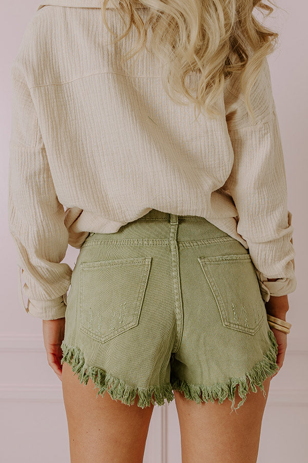 Keep your summer look effortlessly stylish with our sage colored 'Misi' shorts featuring lightweight denim material, a high waistline with belt loops, a hidden zip fly with a button closure, a classic four-pocket cut, and a flattering silhouette that ends in frayed upper-thigh length hemlines!