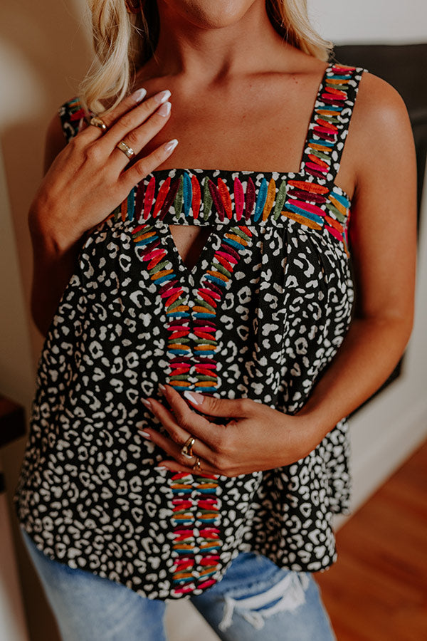 Take a walk on the wild side in our cute black 'The Perfect Timing' shift top featuring lightweight material patterned with a small white leopard print and colorful embroidered detailing, a square neckline, wide sleeveless shoulder straps, and a relaxed silhouette that falls into a straight hemline!