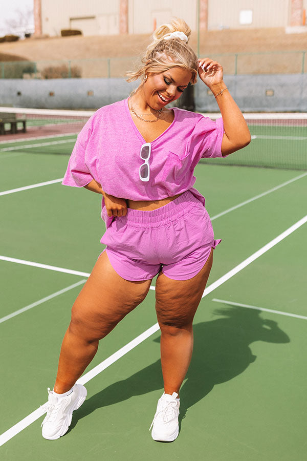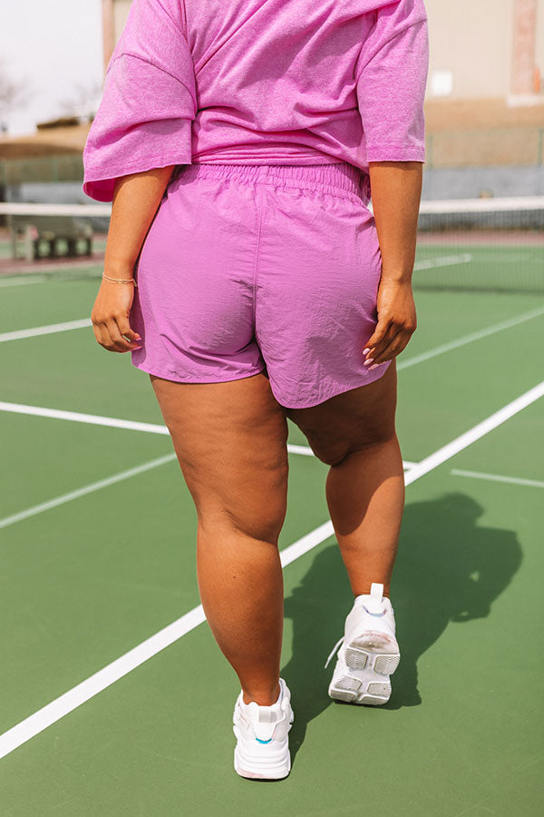 Step up your athleisure game with our trendy violet colored shorts featuring lightweight windbreaker material, a wide and high elastic waistline, and a sporty silhouette that ends in straight upper-thigh length hemlines!