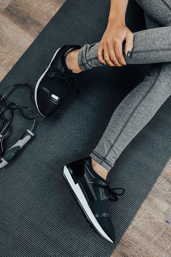 It's okay to be a little obsessed with shoes, so we fully support you rocking our modern black "Skye" sneakers all year long with their lace up silhouettes, below the ankle fit, structured soles, rounded closed toes, and accent faux leather detailing!