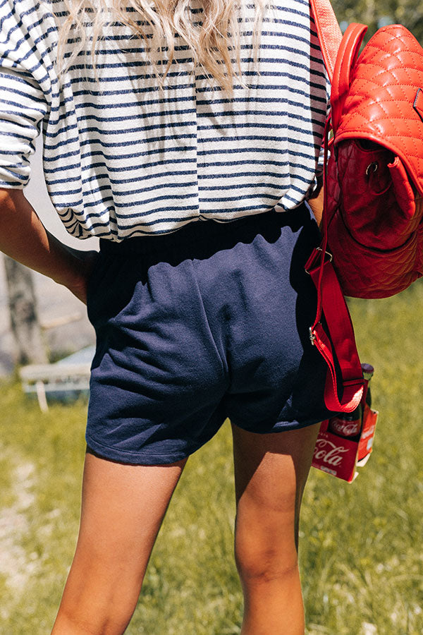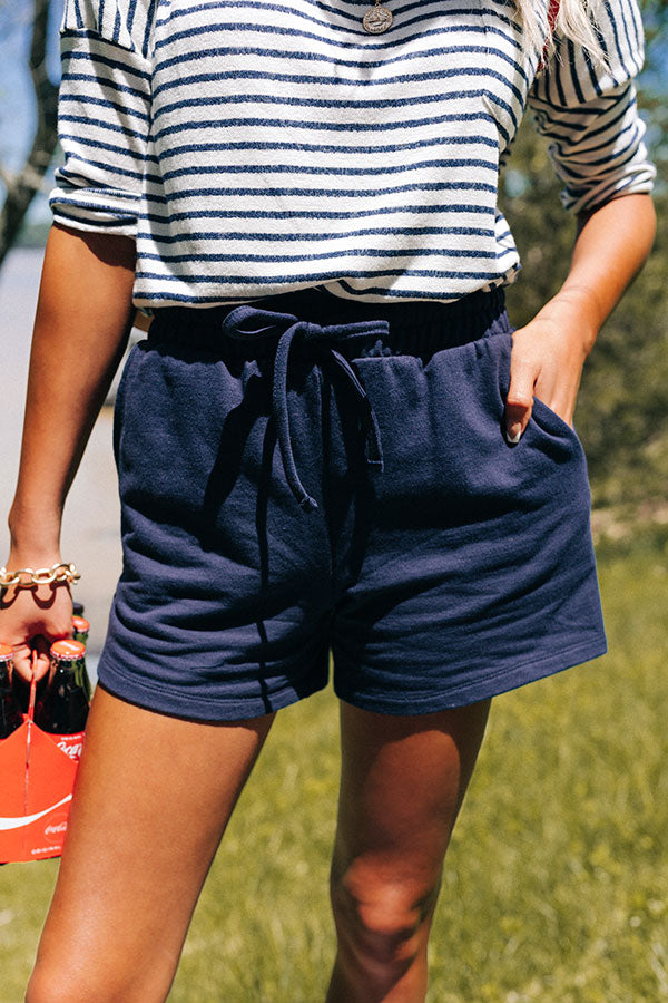 Keep cool and casual all summer long with our simple navy 'Tye Shorts' featuring lightweight flowy material, an elastic waistline with a tie closure, accent side pockets, and a relaxed silhouette that end in straight upper-thigh length hemlines!