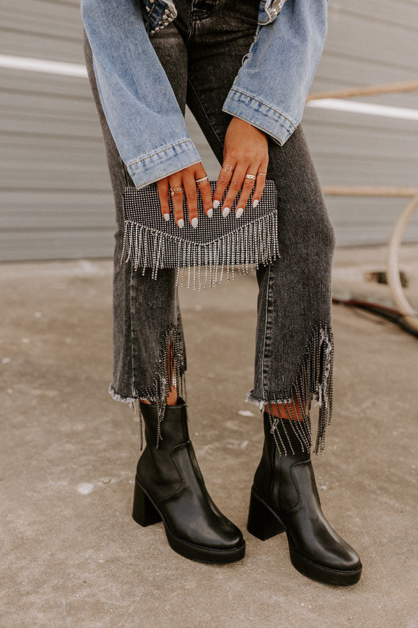Glamorize your look with our glitzy 'VIP Party' clutch featuring shimmering black rhinestone detailing, an envelope closure with tassel trim detailing and a single snap button, and a spacious fully lined satin interior!