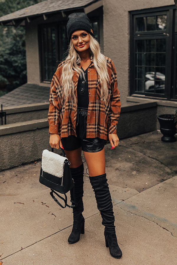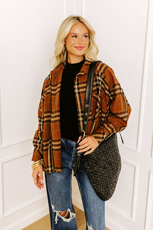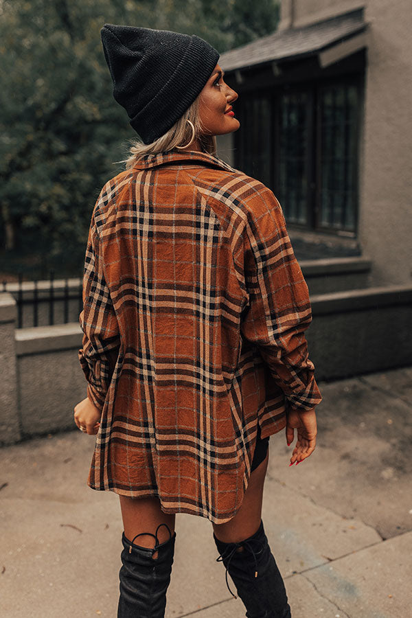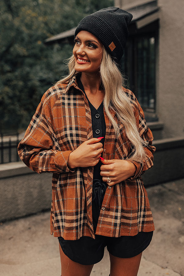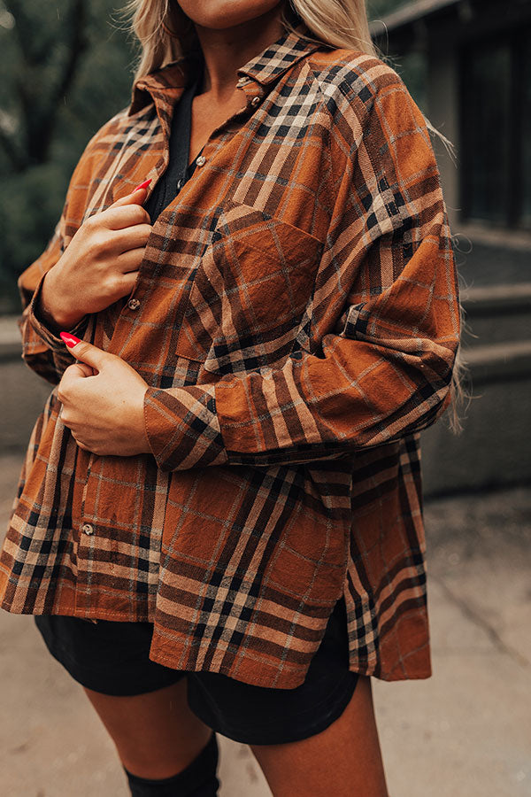 We guaranteed you'll want to wear our cute dark camel colored 'Wait List' top year after year with its soft lightweight material, black plaid print, button down front with a collared neckline, long loose sleeves with button closure cuffs, single accent chest pocket, and relaxed silhouette that falls into a straight front hemline and a rounded back hem!
