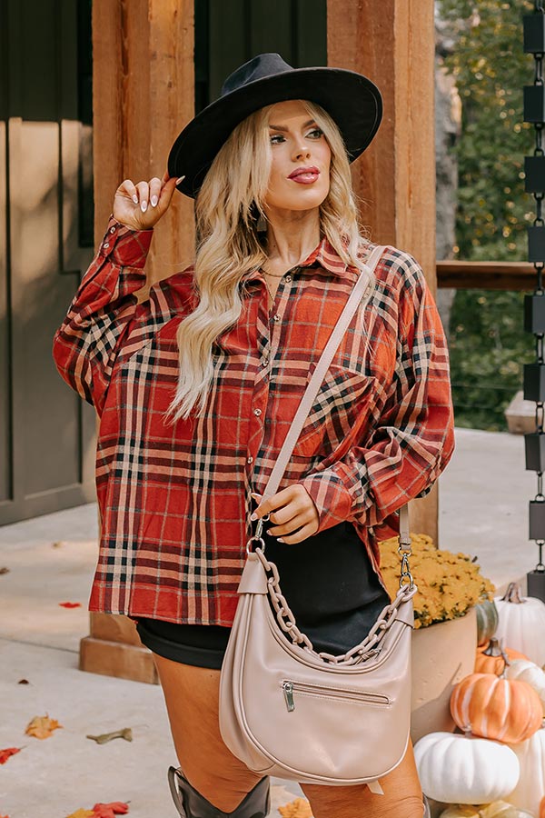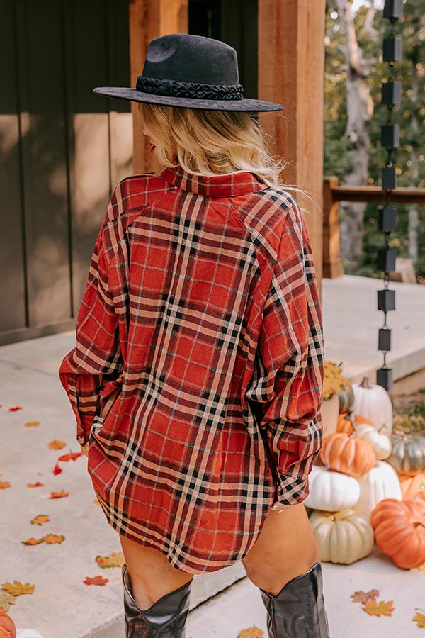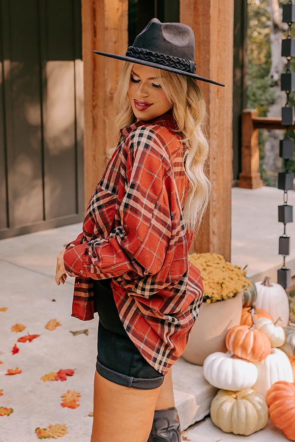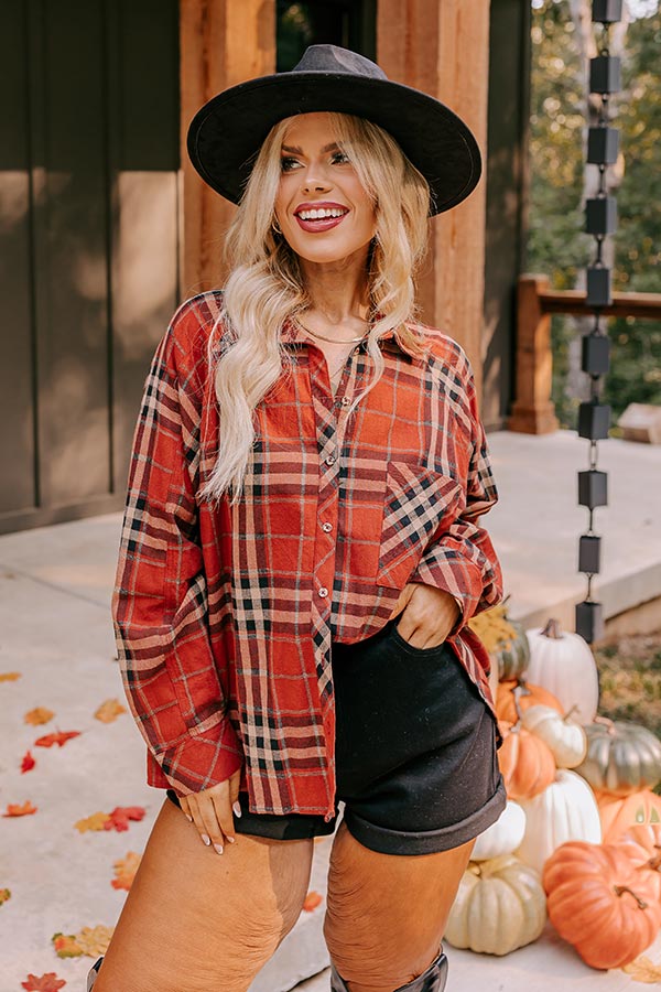 We guaranteed you'll want to wear our cute plus size rust colored 'Wait List' top year after year with its soft lightweight material, black plaid print, button down front with a collared neckline, long loose sleeves with button closure cuffs, single accent chest pocket, and relaxed silhouette that falls into a straight front hemline and a rounded back hem!