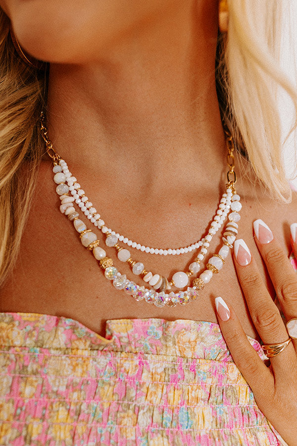 A summer accessory essential, our pretty 'Well Loved' necklace features three layered pieces: a tiny white beaded chain and two longer white beaded chains with a variety of different beads!