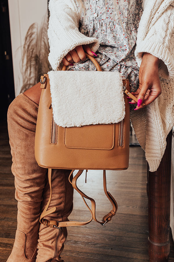 There is no better bag to throw on and go with than our light iced mocha colored 'Well Played' backpack featuring faux leather material, a sherpa flap closure with a snap button, a single handle, two silver zipper accents on the front, two removable and adjustable shoulder straps, and a spacious fully lined pouch with an additional pocket inside!